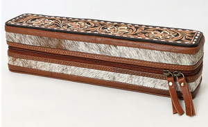 Introducing Rowena hair straightener case, made of soft cowhide leather with western flair. Genuine YKK zippered closure keeps essentials safe. Versatile size of 14in (H) X 3in (W) X 4in (D) to easily carry your belongings. (Quirky and playful tone) Saddle up and ride in style with Rowena!