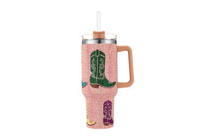 This dazzling tumbler is made for the ones who love their coffee (and their sparkle). Featuring rhinestone-studded cowgirl boots and a high-shine finish, it’s the perfect mix of glam and grit. Available in white or pink, this cup keeps your drinks cold (or hot!) while showing off your Western flair everywhere you go.