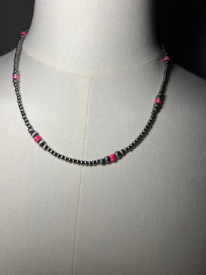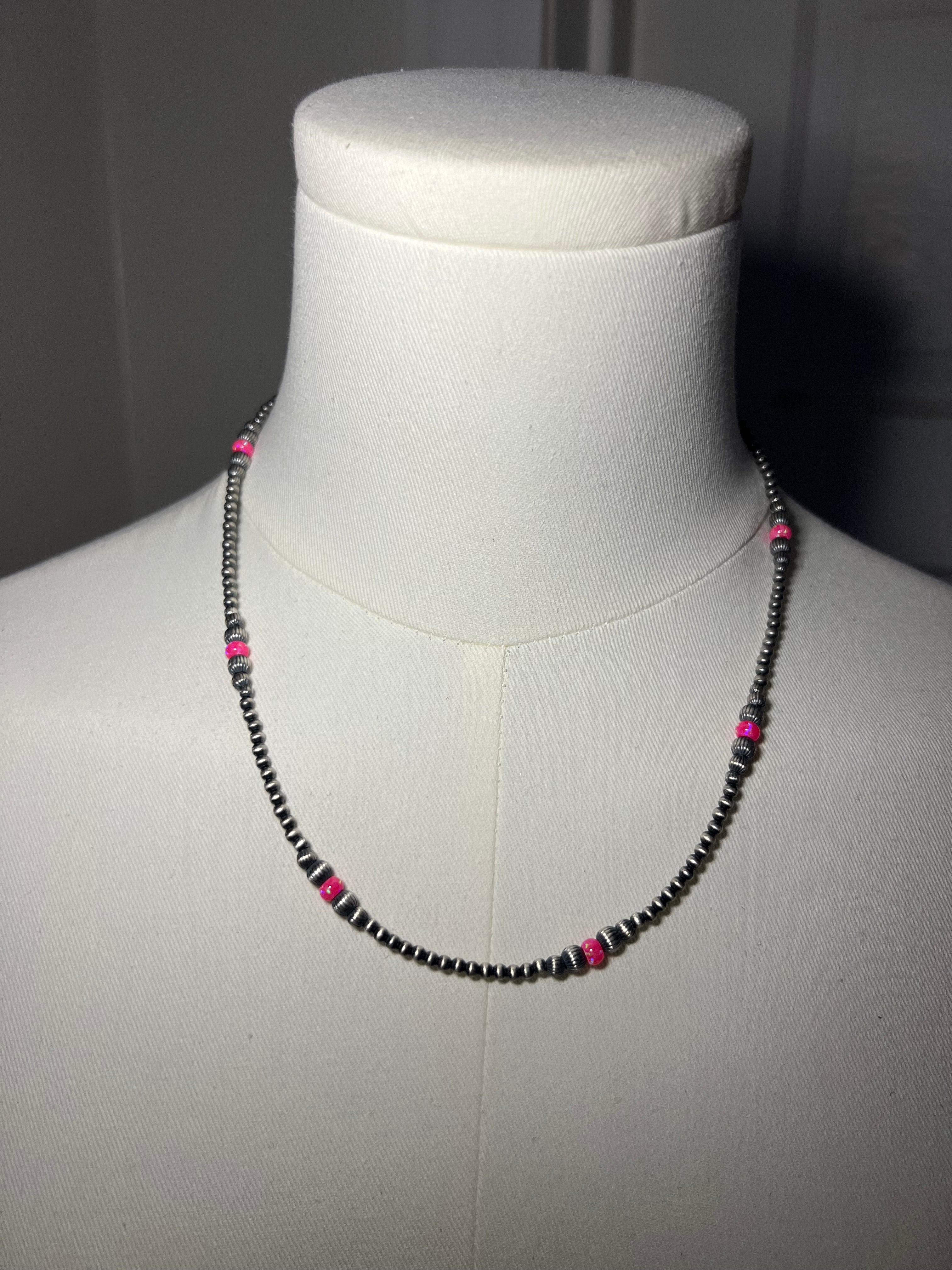 the season’s hottest trend in southwestern jewelry! Hot pink opal mixed with graduated Navajo pearls. Perfect for layering and adding a pop of disco cowgirl!