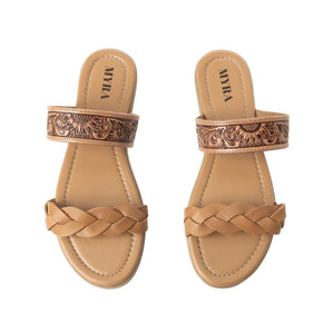 Slip into something effortlessly stylish with these dainty leather sandals featuring a hand-tooled leather strap and a braided leather accent near the toe. Lightweight, feminine, and easy to wear, they’re the perfect grab-and-go sandal for summer. Whether you're dressing up denim or pairing them with a flowy dress, these sandals add the perfect touch of western charm with a delicate twist.