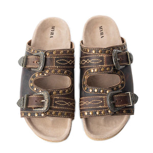 These rustic slip-on sandals bring together western edge and everyday comfort. Designed with weathered-style buckles, antique studs, and a contoured footbed, they offer all the support you need with the style you love. Made with high-quality materials that look and feel premium—without the premium price tag. Perfect for pairing with denim or flowy skirts for a laid-back western vibe.