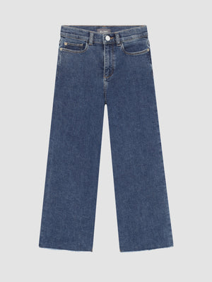 Introducing Calista - the must-have high rise, wide leg pant for your little fashionista. This vintage mid-indigo denim is on trend with brushed gold hardware, khaki stitching, and a raw hem. Made with DL Performance technology and ethically sourced cotton, these pants are not only stylish but also comfortable for everyday wear.