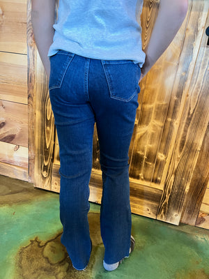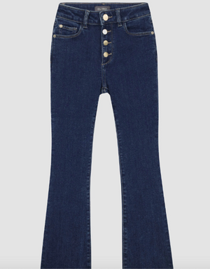 Introducing Trista - the playful, high-rise bootcut denim that combines a classic 5-pocket style with a vibrant mid indigo hue. With quirky faux button detail, brushed gold accents, and light khaki stitching, this pair is perfect for any little fashionista. Made with eco-friendly cotton and stretch technology for a comfy fit.