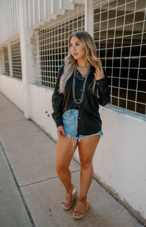 Introducing our Luxe Leather Top - the epitome of elegance and sophistication. Made with 90% polyester and 10% spandex, this button down features luxurious leather and stunning turq pearl snaps for a touch of detail. Perfect for pairing with any outfit, it's a must-have for your wardrobe. True to women's size.