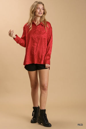 Make a statement with color and attitude in this classic button-down blouse! With a leopard print background and a range of gorgeous hues to choose from, you’ll have a hard time deciding – but whichever one you do pick, you can be sure it’s gonna look FABULOUS with your favorite jeans, skirt, or satin pants!