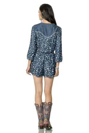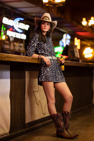 We’re really on a roll with rompers, and this one might be our best yet – loose, lightweight, easy to wear and pair and the denim gives it an inherent cowgirl feel. This star-studded denim romper features a custom DDR print and it has a retro yoke that’s accented with western smiley welts and best of all: trimmed in rhinestones! Throw this on with your favorite boots, and you’re gonna be the darling of the dancehall.