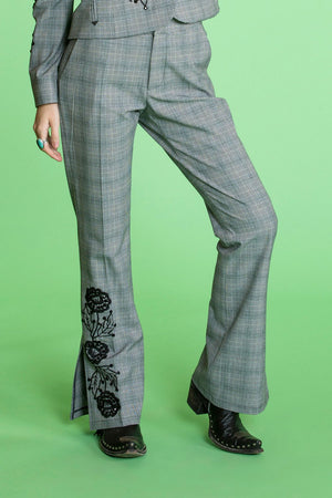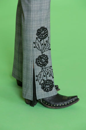 Our sassy take on the suit, we drew inspiration from the late Nudie Cohn’s ostentatious twist on the western fashion industry. Whether you have a special night out planned, or love to dress your best, the edgy embroidery that perfectly sits atop the ankle slit on these pants will not disappoint. Tip: pair with the Twisted Jacket to complete your look.
