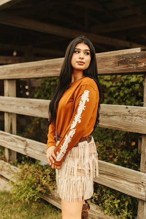 Super soft cotton long sleeve top with lace cutout detail on the sleeves. So cute and comfortable- perfect for layering or on its own!