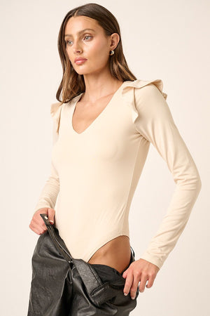 Look lively in the Mila Bodysuit! This knit beauty features a flattering V-neck with fun ruffle detail on the shoulder, long sleeves, and a snap button closure at the bottom—all in a comfy blend of 90% polyester and 10% spandex. Take it out for a spin and show them who's boss!