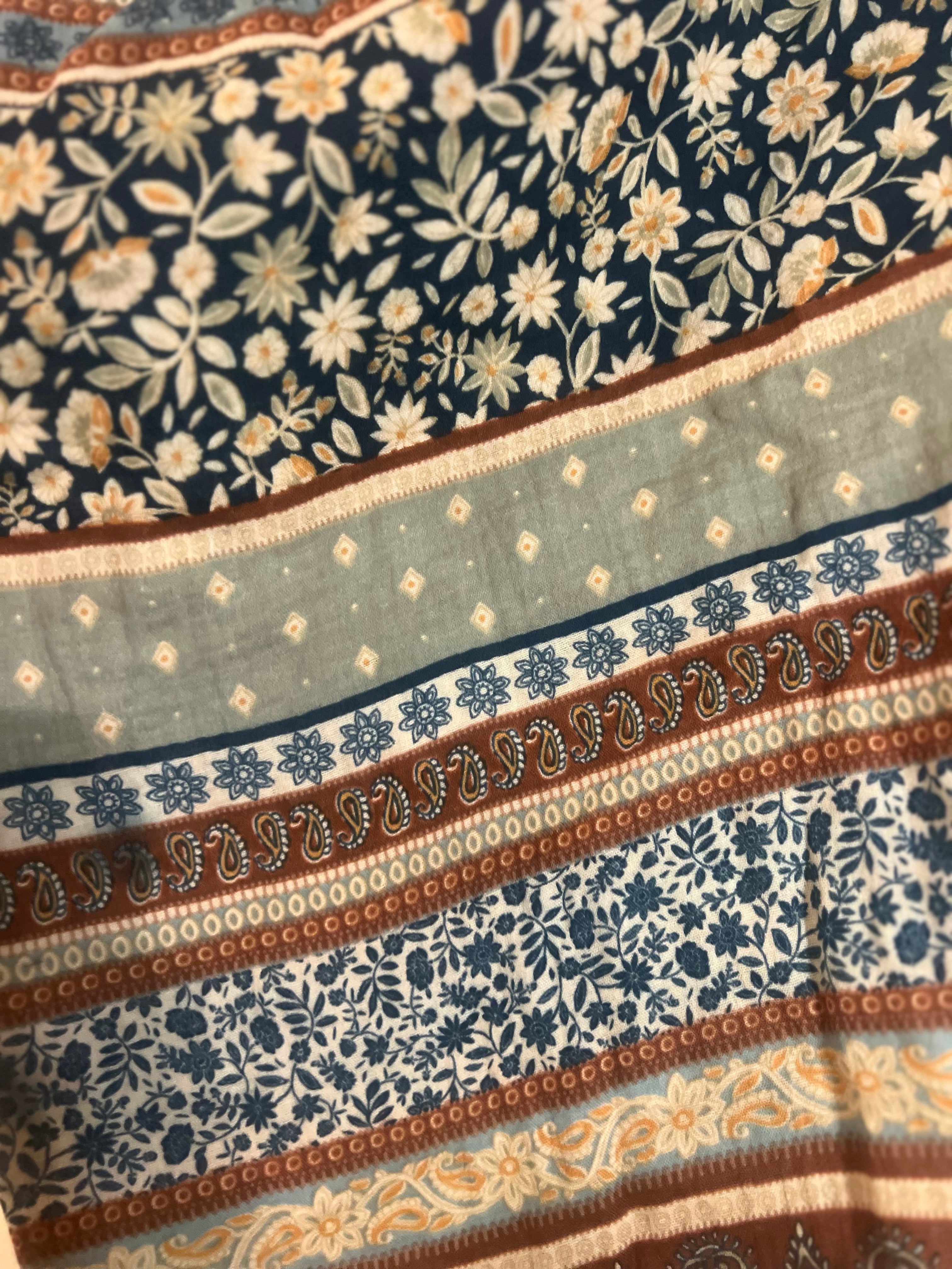 Not your average tee. This unique top pairs a classic T-shirt body—complete with a bold rodeo cowboy graphic—with breezy poncho-style sleeves. The muslin-like sleeve fabric features a mix of warm fall prints for a cozy, one-of-a-kind look.