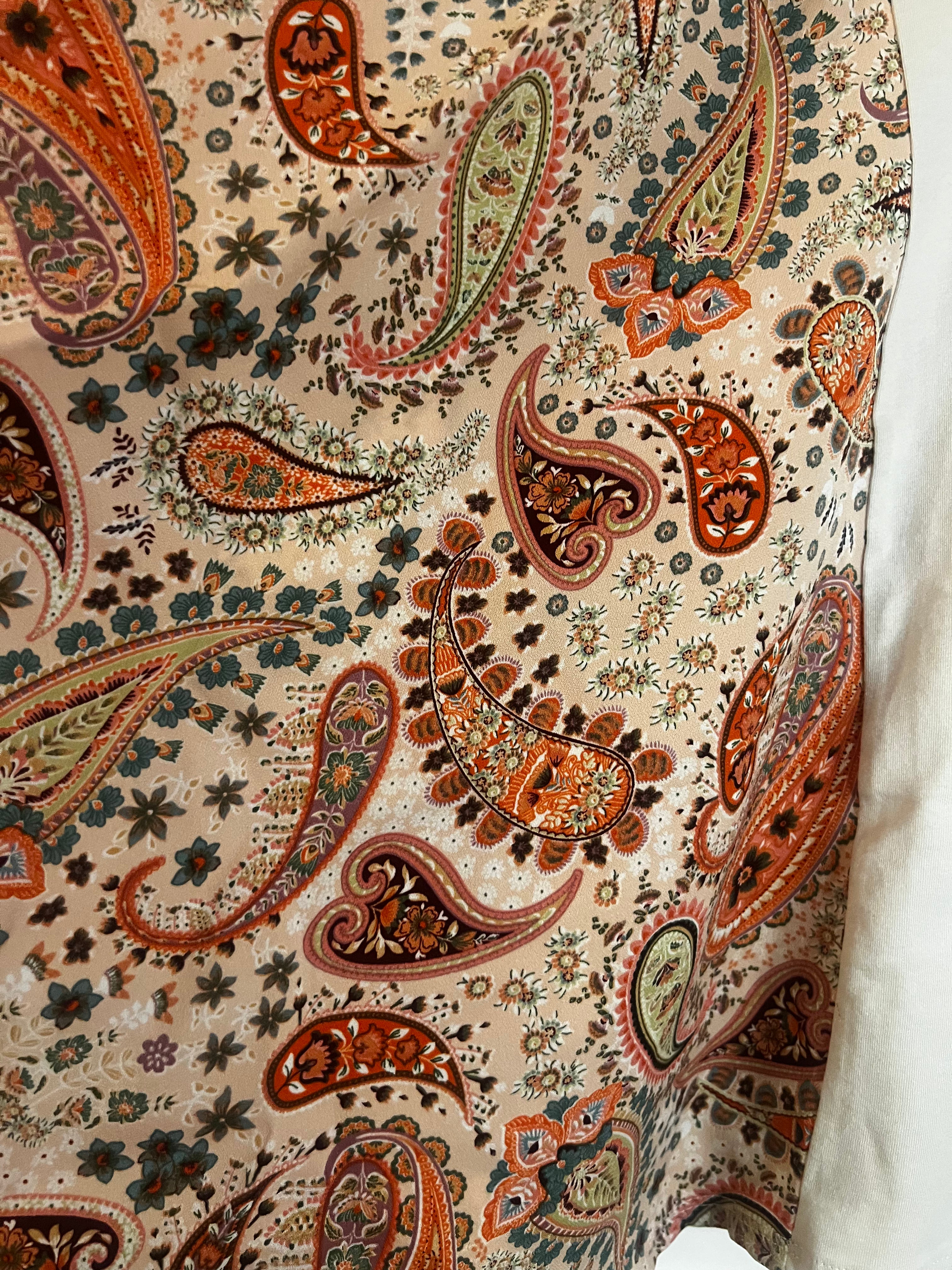 A poncho and a T-shirt had a perfect little mashup, and this is it. The white tee body shows off a western graphic, while the satin sleeves bring flowy, poncho-style drama in sunset pinks and oranges. It fits loose and easy like a poncho but keeps the casual comfort of a tee — a truly one-of-a-kind combo for your closet.