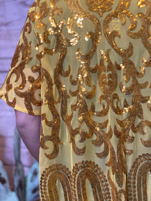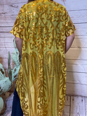 The All Day Long sequin mesh kimonos are a bit higher in the front and lower in the back. They have sleeves that come just above the elbow. Absolutely beautiful and